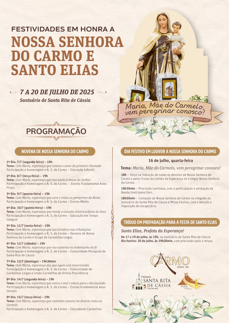Começa nesta segunda-feira, 7 de julho, a tradicional Novena de Nossa Senhora do Carmo, promovida pelo Colégio Nossa Senhora do Carmo, em parceria com a Congregação das Irmãs Carmelitas da Divina Providência e a Comunidade Paroquial de Santa Rita de Cássia. As celebrações seguem até o dia 20 e acontecem no Santuário de Santa Rita de Cássia, sempre às 19 horas, com exceção dos domingos, quando a missa será às 19h30.